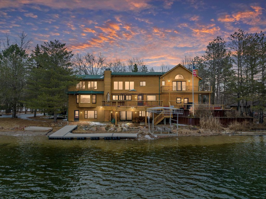 Wooded private 2 acres of Lakefront Living on Lake Waumegah! This west-facing lot has 220 ft of sandy beachfront providing you access to a resident-only all-sports lake. At the end of a private cul de sac road sits this massive log home that features over 6,000 sq ft of finished space. Sunsets pour light through massive windows on each of the 3 levels facing the lake. This home was designed to take advantage of the lake views and the west-facing exposure. Recent upgrades include a remodeled kitchen, a new roof, new windows, and mechanical & HVAC upgrades. The main floor features multiple staircases to the lofted second floor and open-concept living areas. The dining room, kitchen, and great room are great for hosting and entertaining. The second floor features a huge primary suite with a standup shower, a clawfoot tub, a private deck overlooking the lake, and a massive walk-in closet. The finished walk-out basement has a wet bar, 2 full bathrooms, 2 bedrooms, and 2 fireplaces. This home includes a hot tub, a whole home generator, Marvin windows, an attached garage, a detached garage/workshop, and much more!