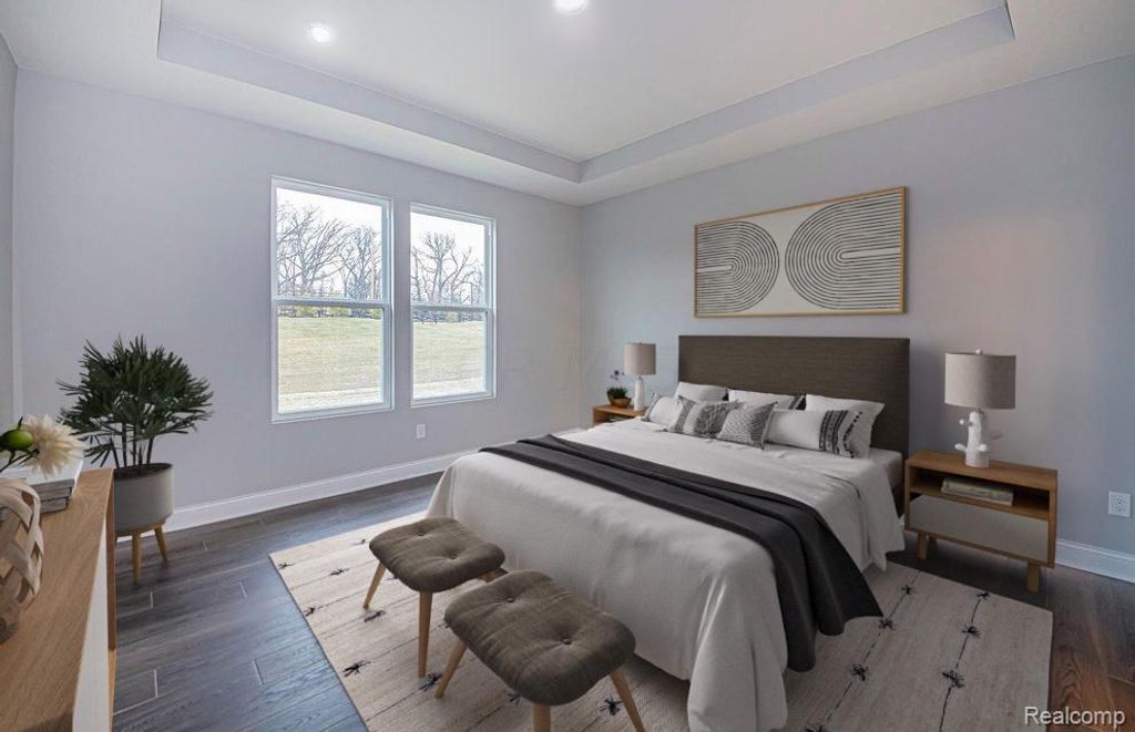 Estimated move in September-November. Welcome to the Bedford floorplan, a thoughtfully crafted ranch home located in the desirable Corners at Cherry Glen community in Macomb Twp. Offering more than 1,880 square feet of single-level living, this open-concept design blends comfort and functionality with modern style. The impressive gathering room features dramatic 11-foot ceilings and flows effortlessly into the cafe and kitchen, creating an inviting space for entertaining or relaxing at home. The kitchen is beautifully appointed with white 42" maple cabinetry with crown molding, quartz countertops, Whirlpool stainless steel gas appliances, and luxury vinyl plank flooring for both durability and style. The spacious owner's suite provides a private retreat with a large walk-in closet, dual sink vanity, and a tiled walk-in shower complete with a generous sitting bench. The secondary bedroom is positioned at the front of the home and offers its own full ensuite bath, making it ideal for guests or family members seeking privacy. A centrally located laundry room, prepped for an electric dryer, adds everyday convenience. Built with energy-efficient construction and enhanced with stylish upgrades throughout, this home delivers quality craftsmanship in a prime location. Conveniently located just minutes from shopping, dining, and I-94 access, this home offers easy living in a highly sought-after community. Certain images are virtually staged to illustrate layout and scale. Property is unfurnished.