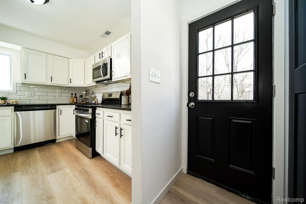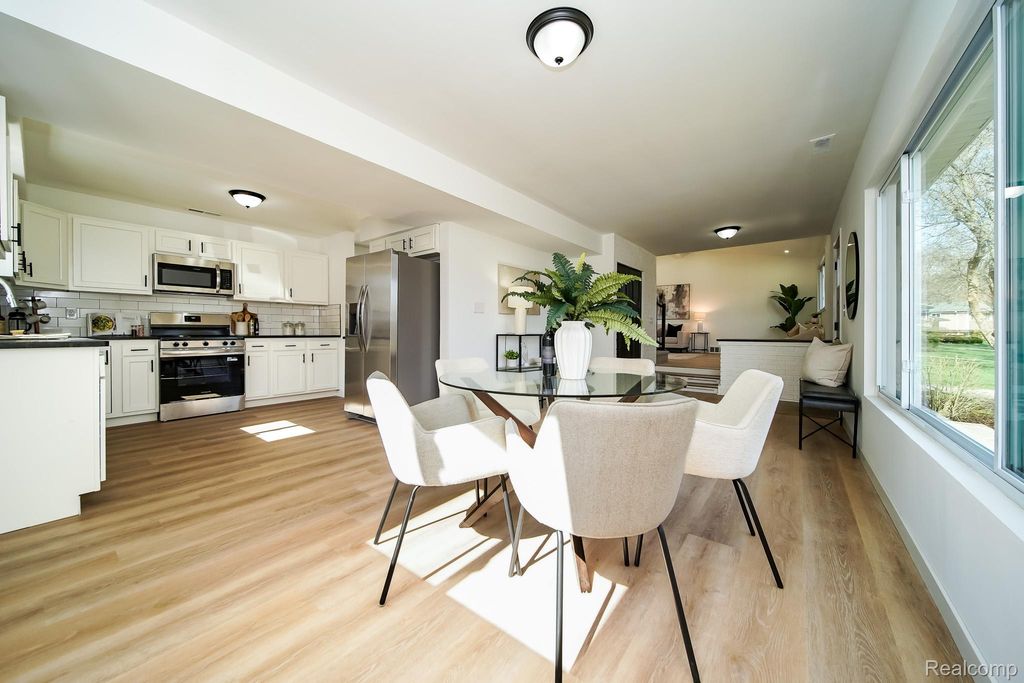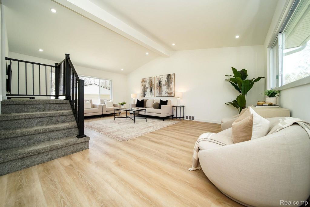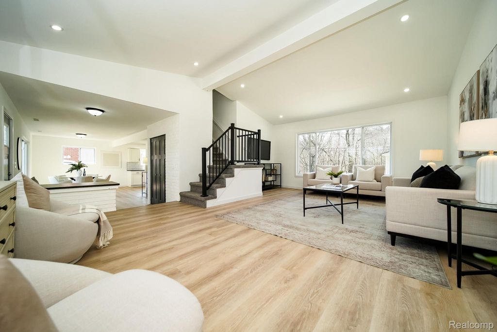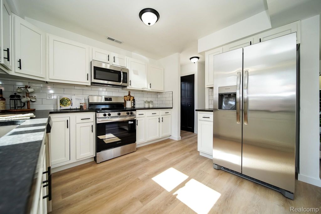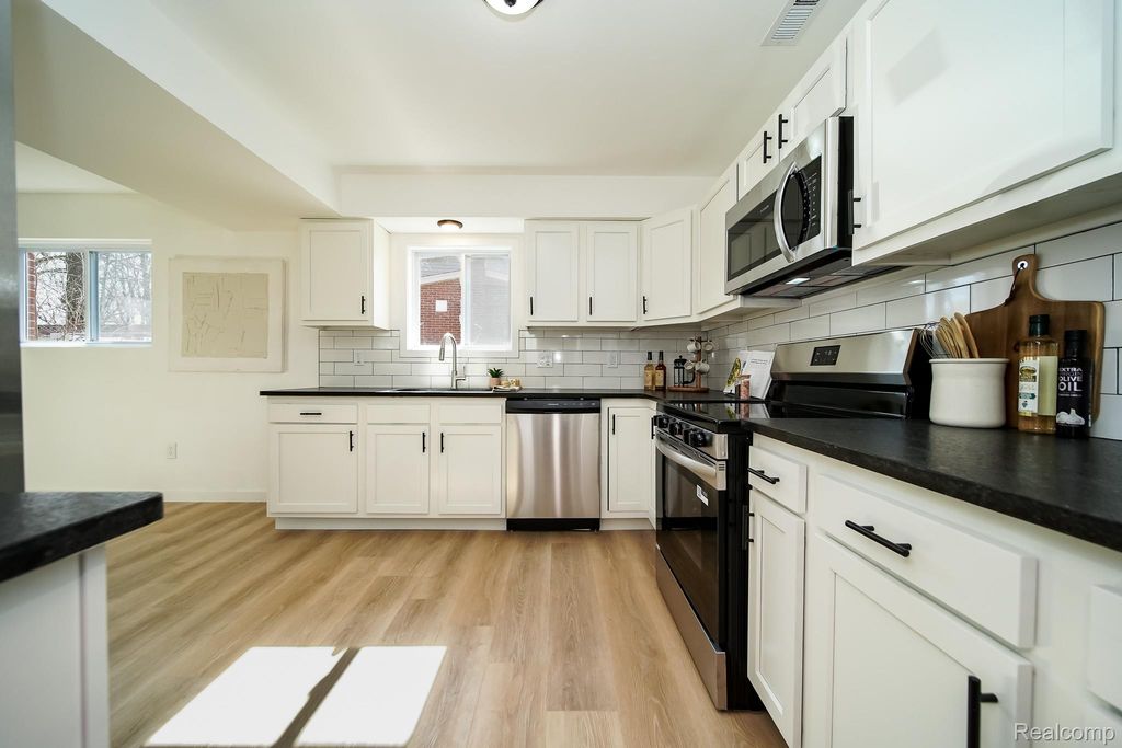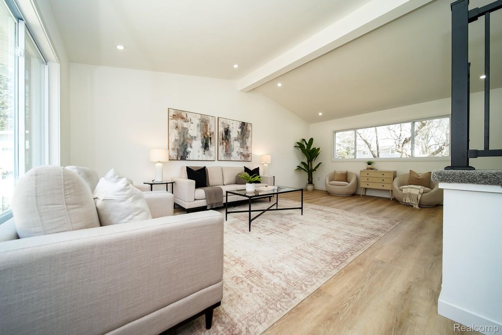 Very nicely completely updated colonial on a deeper (135') lot backing to a wooded ravine lot with creek...deep in the sub. Kitchen features newer whte Shaker style cabinets, granite counters, undermount stainless steel sink, subway tile backsplash and a full set of included stainless steel appliances. Combo dining area/living room off kitchen. Three steps up to a large family room with vaulted beamed ceiling. First floor laundry. Half bath with newer vanity, top and fixtures. Upper main bath with newer double vanity, quartz top, dual undermount sinks, custom subway tile tub surround, seated tub, new floor and newer fixtures. Bedrooms have vaulted ceilings and new carpet. Primary bedroom with double closets. New paint and fixtures throughout. Clean open basement with newer (2025) furnace, hwh and central air. Late model garage (1997) with newer siding, roof and rollup door. New roof and windows. Taxes are currently non-homestead but will be rated at a lower millage for an owner occupant buyer. Seller will supply a Certificate of Occupancy for closing. Owner is a licensed broker in the state of Michigan.