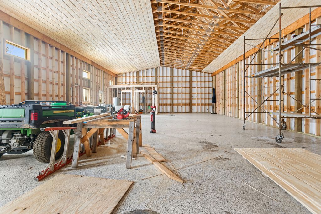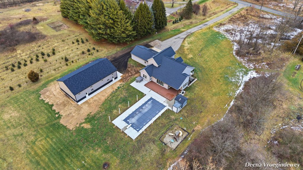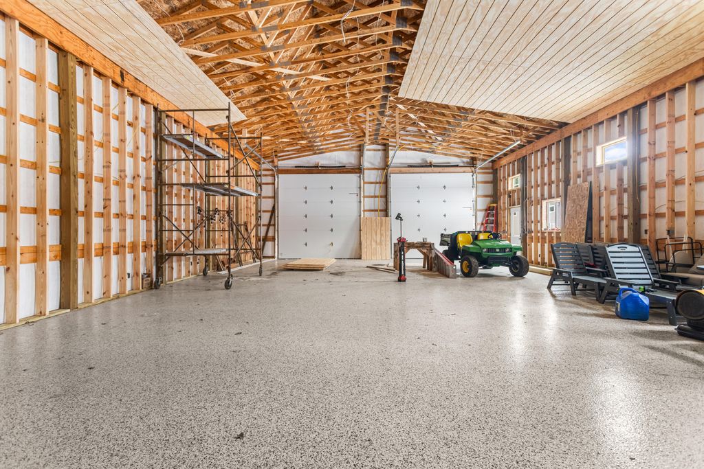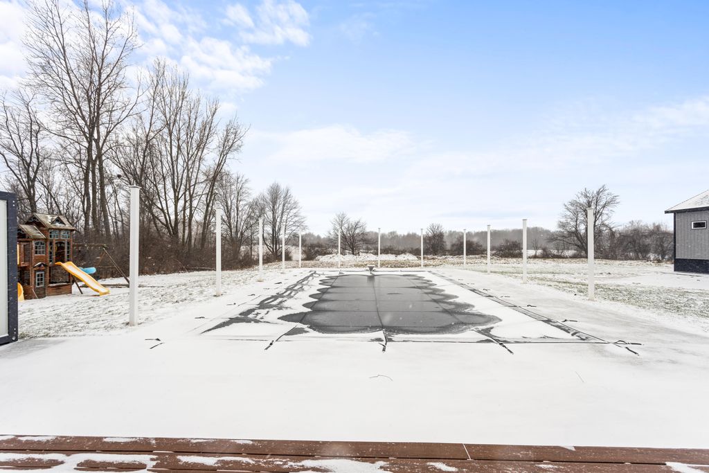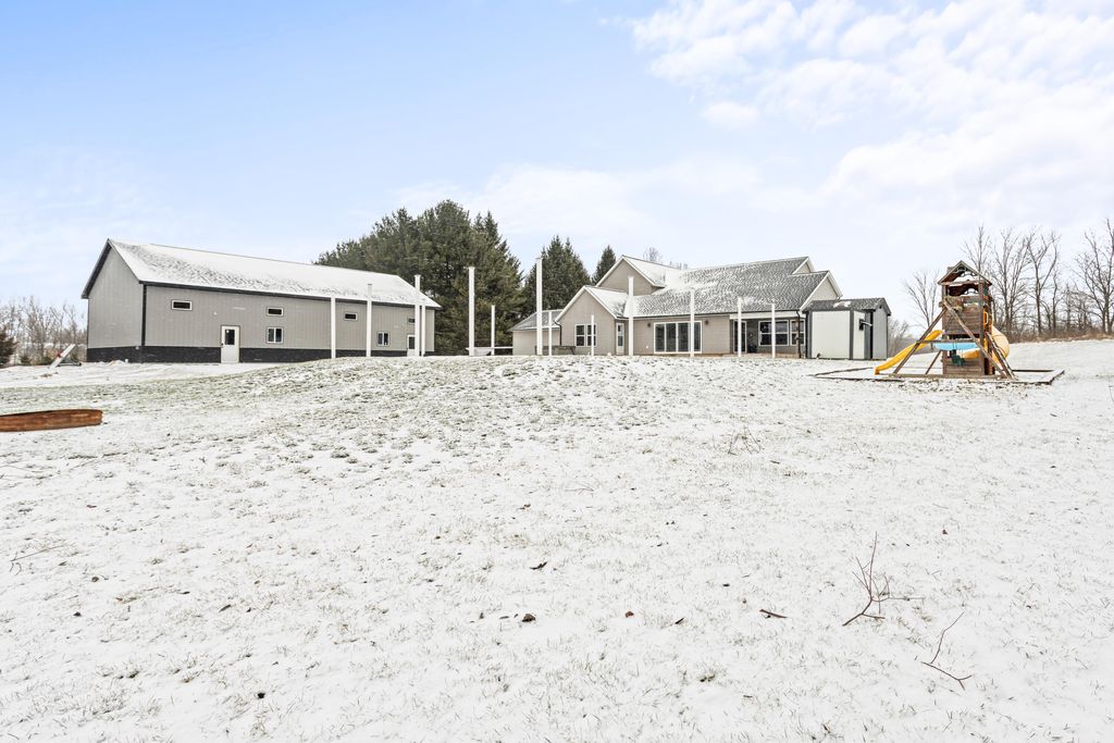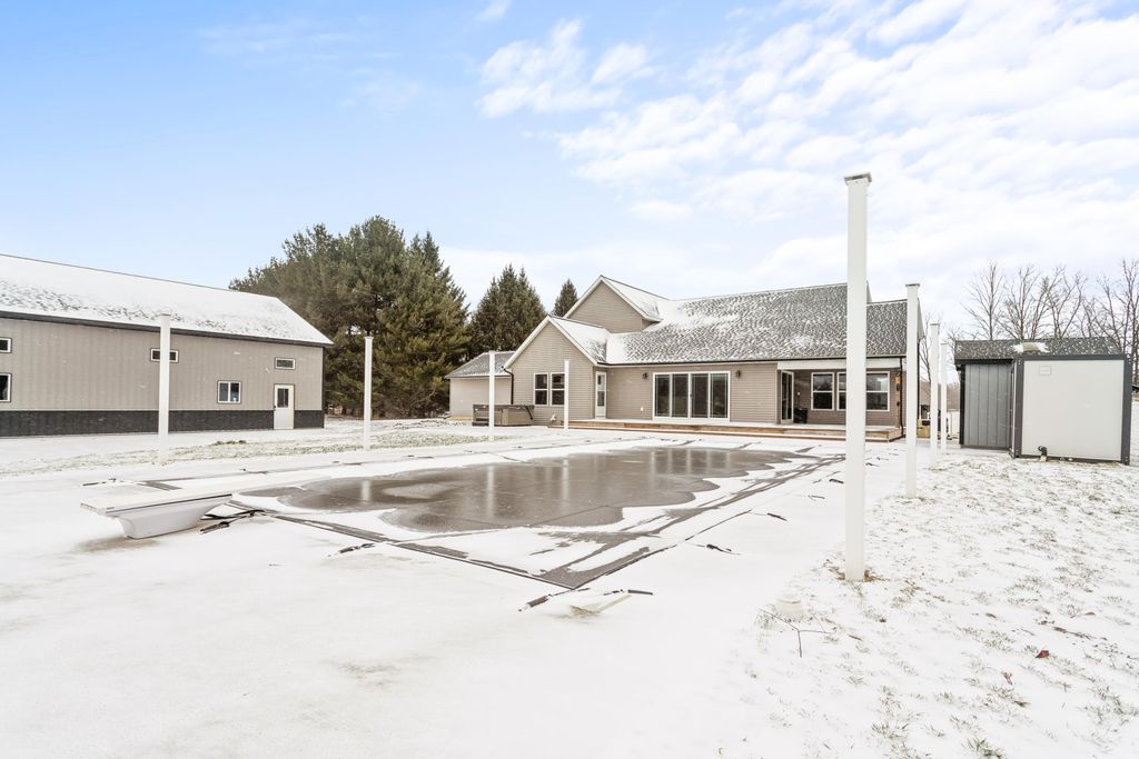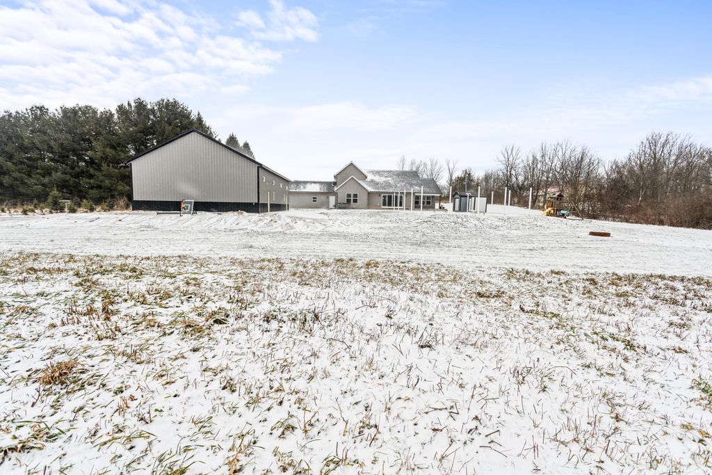 Newer 6-year-old home showcasing modern design and thoughtful functionality throughout. The main floor features a desirable primary suite with direct access to the deck, perfect for relaxing mornings or evenings outdoors. Enjoy a huge, expansive open-concept kitchen complete with quartz countertops, a spacious dining area, and a bright living room ideal for entertaining. Also on the main level is a newly added mudroom and a flexible office or second bedroom to suit your needs.Upstairs offers two additional bedrooms and a full bathroom. The finished basement provides a large recreation area, two more bedrooms, one bathroom, and plenty of storage space.If the interior doesn't sell you, the exterior certainly will. A brand-new 35x60 pole barn features epoxy floors, a finished ceiling, rough-in plumbing for a future bathroom, and both gas and electric service. The outdoor amenities continue with a 20x40 heated saltwater pool complete with an 8-foot sun ledge and automatic cover,plus a storage shed and a truly unique outdoor bathroom and shower. To top it all off, the oversized heated three-stall garage makes this property stand out even more. Call today for your private showing.