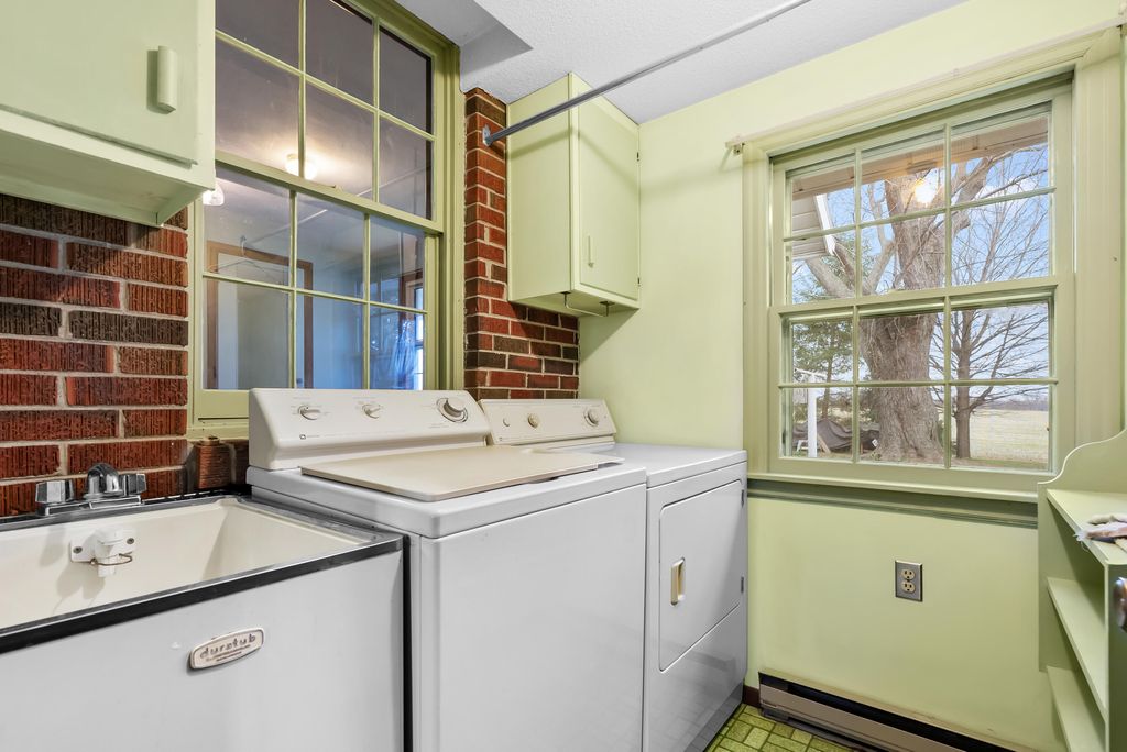 1887 sq. ft., two story custom built brick farmhouse with addition in 1975, plus 500 sq. ft. detached office/apartment, on 1.4 acres, 5844 S. Scottdale Road, Berrien Springs, 49103. 4 bedrooms, 2 baths, full dry partially finished basement (460 sq. ft. of 810 sq. ft.), separate office area, laundry on first floor, well insulated, 200 amp breaker box, whole house water filter, water softener, dehumidifier, dinner bell, flagpole and two detached 1 1/2 car garages about 50 ft. from house in 32' x 48' pole barn. Lakeshore Schools. Walking distance to Royalton Township Park and Tri Unit Fire Station. Well water and 2 septics. All electric, each room with its own thermostat. New stove, dishwasher and garbage disposal. All appliances included. Regulation 1960's Brunswick pool table. Somefurnishings available. Large window A/C that services the first level only. Nicely landscaped. You should expect limited surrounding farm activities. Pole barn includes a 500 sq. ft. farm office with finished kitchen, one-bedroom, full bath and living area with wood burning stove. Essentially, 2387 sq. ft. of 4 seasons living area between the 2 buildings (5844 & 5830 S. Scottdale Rd.) or $193 per sq. ft. Residential Rental possibilities. Survey available. High speed internet (Comcast/Xfinity) and natural gas available at the road. New roof in 2013. New seal coating on pole barn roof in 2021. All shutters, windows and exteriors on the house and pole barn were freshly painted in 2021 and 2024. Luxury Vinyl Plank flooring in 2024 on most of the first floor. Some Concord grapes for personal use and farm rental income. Rear yard and pole barn cleanup/removal of farm personal property remains after recent farm estate sale. May consider owner financing with 20% down with approved credit and income. All gray water and septic systems examined in 2023. (Existing PIN 11-17-0030-0040-01-3). Other than replacing the basement carpet (if you choose), the house is move in ready.