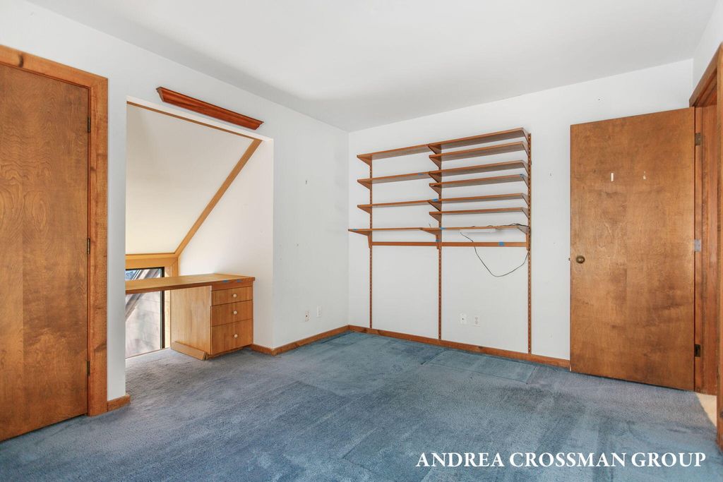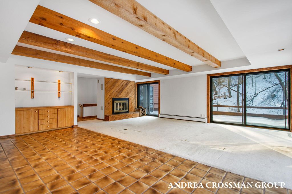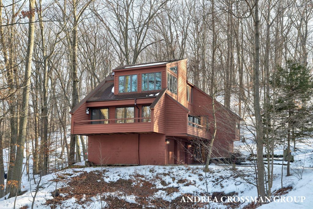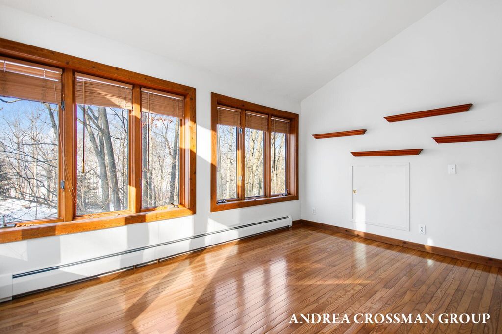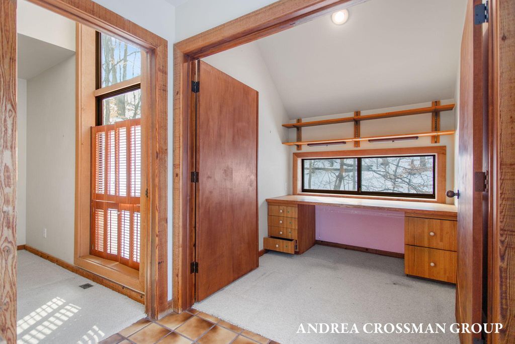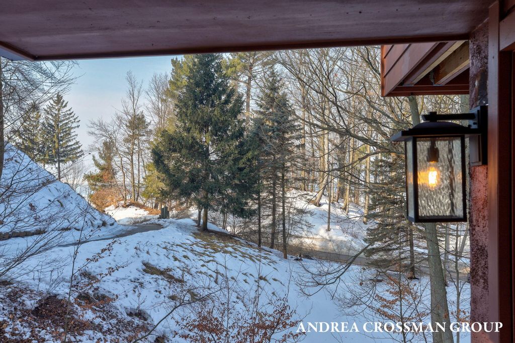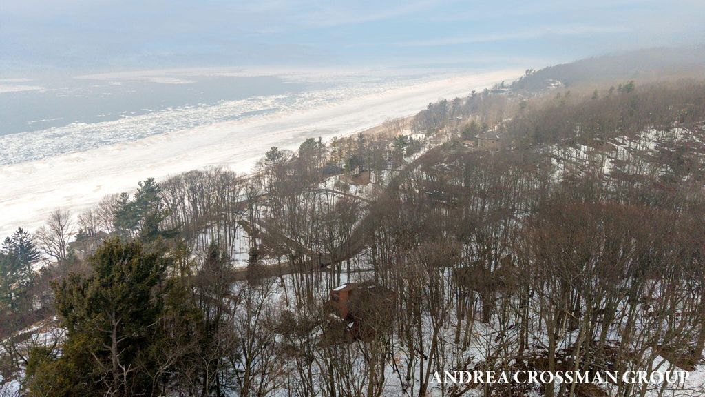 Lake views, private setting, and association beach access directly across the street highlight this ideally located home on the scenic N Shore Estates Road. Enjoy the benefit of a lakeside setting on the east side of the private road while still capturing the lake views and great association beach access just across the road to the sandy Lake Michigan shoreline along a low bluff. Set back among the trees on a private and picturesque lakeside road, this contemporary 1980s home offers a distinctive design with an elevated main level, open living and dining area with fireplace, vaulted breakfast nook surrounded by windows, and a lakeside and southern deck for outdoor living and sunset watching. The upper level features three bedrooms, including a lakeside primary suite with walk in closet, full bath, and sunroom with rows of windows that frame both the lake and surrounding woods. Fantastic location with private association beach stairs just steps away.The walkout lower level includes a two stall garage, workshop area, and half bath. The main level also offers a bedroom, office, and additional half bath. Being sold as is, this is a great opportunity in a premier lakeside location to create your own Lake Michigan retreat.