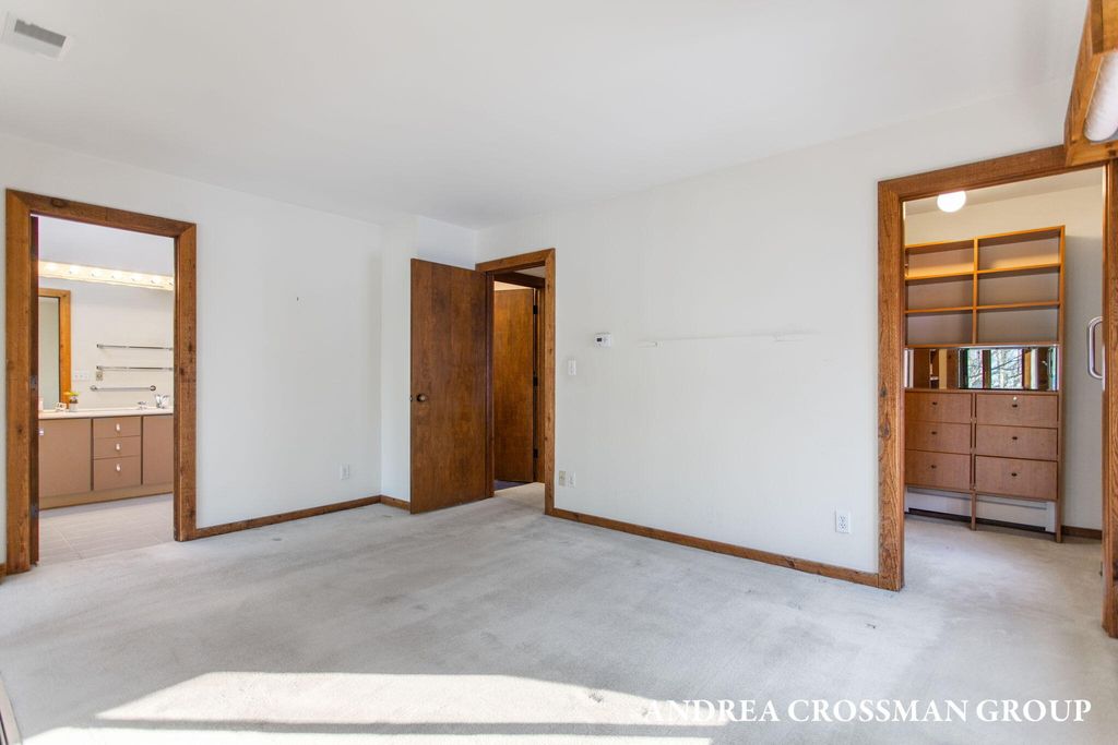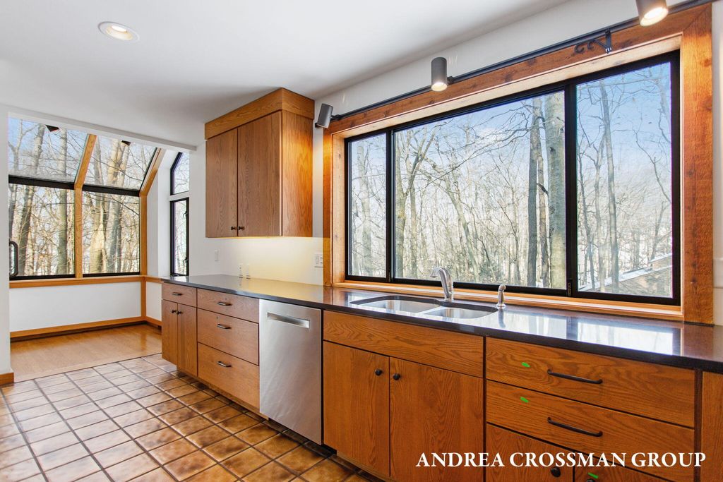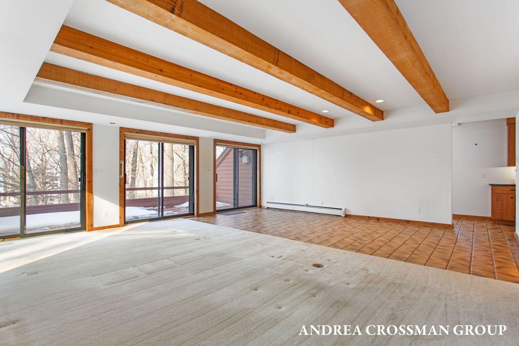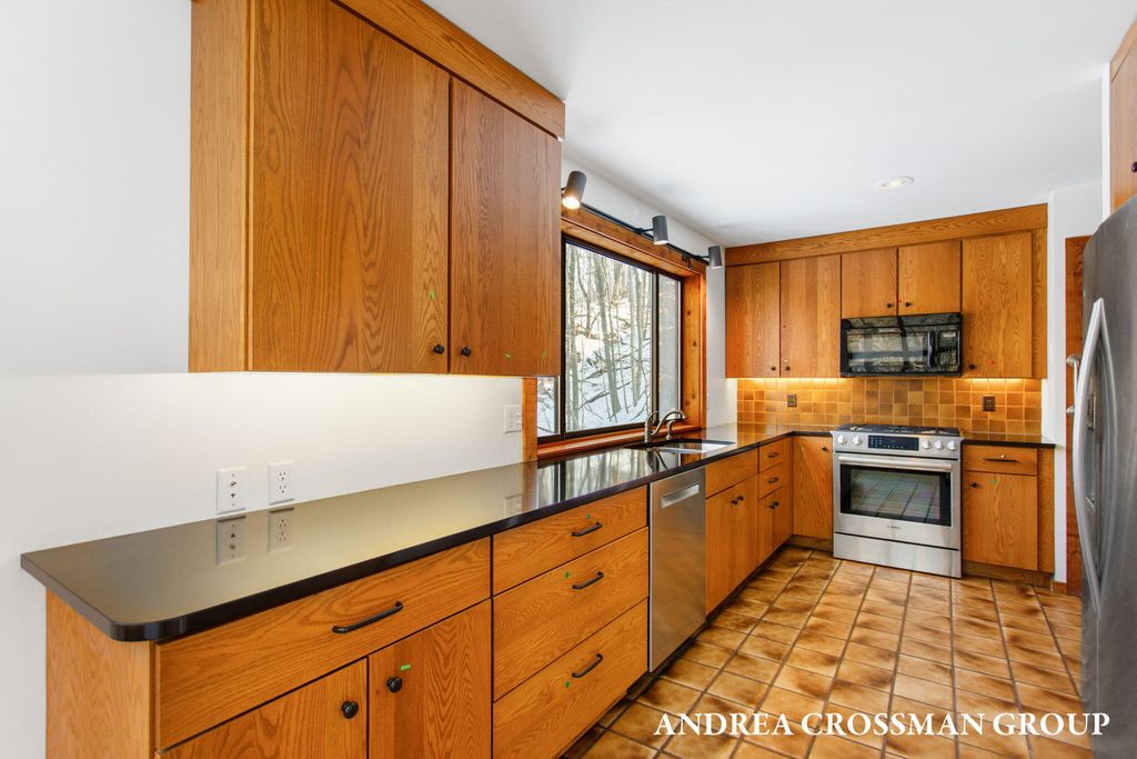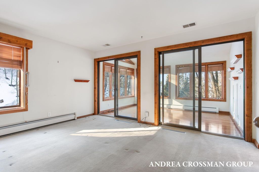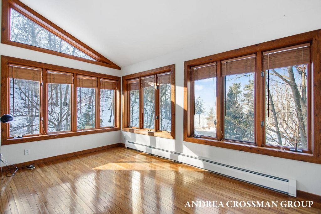 Lake views, private setting, and association beach access directly across the street highlight this ideally located home on the scenic N Shore Estates Road. Enjoy the benefit of a lakeside setting on the east side of the private road while still capturing the lake views and great association beach access just across the road to the sandy Lake Michigan shoreline along a low bluff. Set back among the trees on a private and picturesque lakeside road, this contemporary 1980s home offers a distinctive design with an elevated main level, open living and dining area with fireplace, vaulted breakfast nook surrounded by windows, and a lakeside and southern deck for outdoor living and sunset watching. The upper level features three bedrooms, including a lakeside primary suite with walk in closet, full bath, and sunroom with rows of windows that frame both the lake and surrounding woods. Fantastic location with private association beach stairs just steps away.The walkout lower level includes a two stall garage, workshop area, and half bath. The main level also offers a bedroom, office, and additional half bath. Being sold as is, this is a great opportunity in a premier lakeside location to create your own Lake Michigan retreat.
