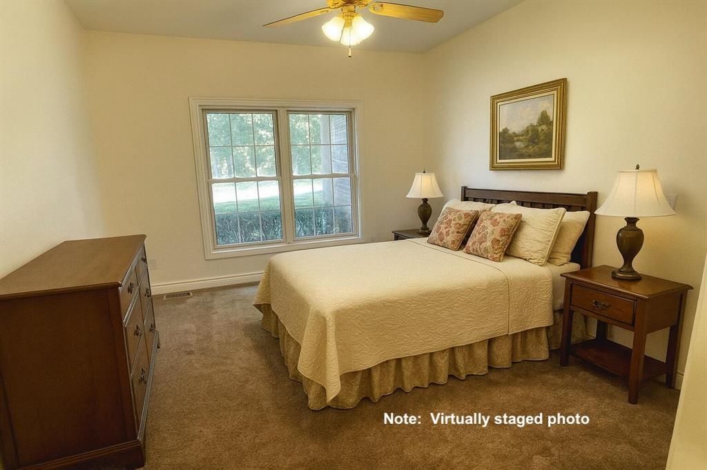 This beautifully maintained 2-bedroom, 2-bathroom condo offers over 1,700 sq ft of total living space, including a finished basement -- perfect for a home office, gym, or media room. Step into the light-filled living room with soaring cathedral ceilings and gleaming hardwood floors that flow seamlessly into the kitchen and dining areas. The updated kitchen features granite countertops, modern cabinetry, and all appliances are included -- move-in ready! The primary suite boasts a private ensuite soaking tub and a generous walk-in closet for added convenience. Enjoy brand new carpeting in the bedrooms and basement, plus a freshly painted interior that gives the home a crisp, modern feel. The 2-car attached garage adds extra storage and security. Located in the Traditions at Cambridge, residents enjoy access to a clubhouse with pool, gym and tennis courts. Sidewalk-lined streets make it perfect for walking, and you're just minutes from top shopping, dining, and daily conveniences.